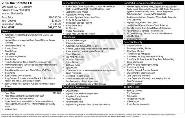 Comes with a Lifetime Powertrain Warranty at no extra charge on qualifying new vehicles. Coverage that lasts as long as you own the vehicle with no mileage limits. See dealer for full details and exclusions. Price includes: $2500 - KFA Dealer Choice Program: $2500 discount and 5.25% APR for 36 months. $30.08 per $1000 financed. Available to well qualified buyers who finance through Kia Finance America. 506. Exp. 01/02/2026 $500 - Sticker Sales Event Retail Bonus Cash. Exp. 01/02/2026