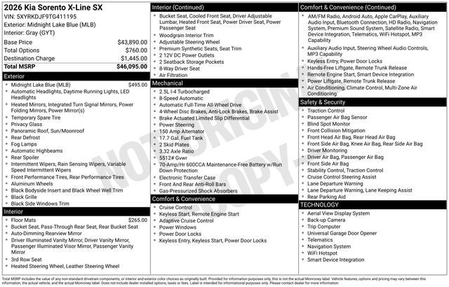 X-Line SX AWD 8 Speed Dual Clutch 2.5L I4 DGI Turbocharged DOHC 16V LEV3-SULEV30 281hp Price includes: $2500 - KFA Dealer Choice Program: $2500 discount and 5.25% APR for 36 months. $30.08 per $1000 financed. Available to well qualified buyers who finance through Kia Finance America. 506. Exp. 02/02/2026