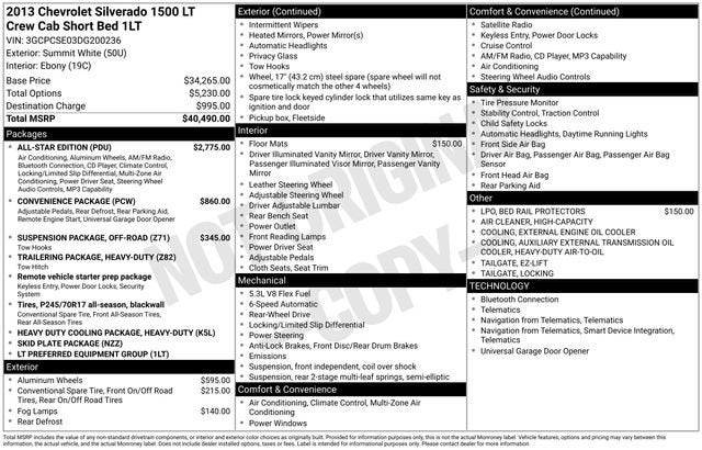 17 x 7.5 5-Spoke Aluminum Wheels, 17 x 7.5 6-Lug Chrome-Styled Steel Wheels, 18 x 8 Aluminum Wheels, 6 Speaker Audio System Feature, 6 Speakers, 6-Way Power Driver Seat Adjuster, ABS brakes, Air Conditioning, All-Star Edition, AM/FM radio: SiriusXM, AM/FM Stereo w/CD Player & MP3 Playback, AM/FM Stereo w/MP3 Compatible CD Player, Bedrail Protectors, Bluetooth® For Phone, Body-Colored Bodyside Moldings, Bodyside moldings, Bumpers: chrome, CD player, Chrome Grille Surround, Color-Keyed Carpeting w/Rubberized Vinyl Floormats, Compass, Convenience Package, Delay-off headlights, Driver & Front Passenger Illuminated Visor Mirrors, Driver door bin, Driver vanity mirror, Driver-Side Manual Lumbar Control Seat Adjuster, Dual front impact airbags, Dual front side impact airbags, Dual-Zone Automatic Climate Control, Ebony Deep Ribbed Rubber All-Weather Mats, Electric Rear-Window Defogger, Electronic Stability Control, Emergency communication system: OnStar Directions & Connections, EZ-Lift Tailgate, Front 40/20/40 Split-Bench Seat, Front anti-roll bar, Front Black Recovery Hooks, Front Center Armrest w/Storage, Front Halogen Fog Lamps, Front reading lights, Front wheel independent suspension, Fully automatic headlights, Heated door mirrors, Heated Power-Adjustable Black Outside Mirrors, Heavy Duty Cooling Package, Heavy-Duty Air-to-Oil External Engine Oil Cooler, Heavy-Duty Auxiliary External Transmission Oil Cooler, Heavy-Duty Handling/Trailering Suspension Package, Heavy-Duty Rear Automatic Locking Differential, Heavy-Duty Trailering Package (Retail), Illuminated entry, Leather-Wrapped Steering Wheel, Locking Tailgate, Low tire pressure warning, LT1 Equipment Group, Occupant sensing airbag, Off-Road Suspension Package, Outside temperature display, Overhead airbag, Overhead console, Panic alarm, Passenger door bin, Passenger vanity mirror, Power Door Locks w/Remote Keyless Entry, Power door mirrors, Power steering, Power windows, Power Windows w/Driver Express-Down, Power-Adjustable Pedals For Accelerator & Brake, Premium Cloth Seat Trim, Radio data system, Rear reading lights, Rear seat center armrest, Rear step bumper, Remote keyless entry, Remote Keyless Entry w/2 Transmitters, Remote Vehicle Starter System, Security system, SiriusXM Satellite Radio, Skid Plate Package, Solar-Ray Deep-Tinted Glass, Speed control, Split folding rear seat, Steering Wheel Mounted Audio Controls, Tachometer, Tilt steering wheel, Traction control, Trip computer, Ultrasonic Rear Parking Assist w/Audible Warning, Universal Home Remote, Variably intermittent wipers, Voltmeter.