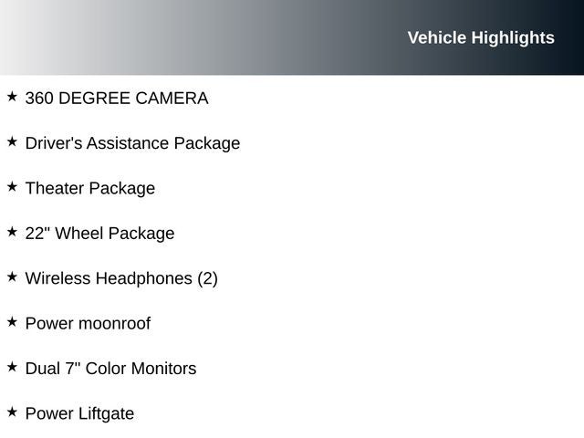 - THEATER PACKAGE: Wireless Headphones, Heated 2nd-Row Seats, Dual 7 Color Monitors