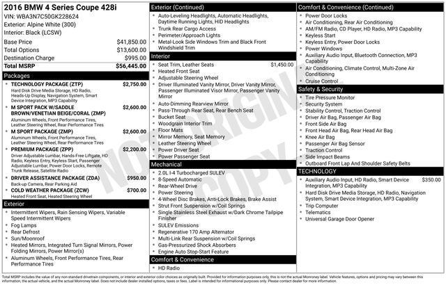 Alpine White 2016 BMW 4 Series 428i RWD 8-Speed Automatic 2.0L 4-Cylinder DOHC 16V Turbocharged 4-Wheel Disc Brakes, 9 Speakers, ABS brakes, Advanced Real-Time Traffic Information, Aerodynamic Kit, Air Conditioning, Alloy wheels, AM/FM radio, Anti-whiplash front head restraints, Auto-dimming door mirrors, Auto-dimming Rear-View mirror, Automatic temperature control, BMW Online & BMW Apps, Brake assist, Bumpers: body-color, Burl Walnut Wood Trim Pearl Gloss Chrome Highlight, CD player, Comfort Access Keyless Entry, Delay-off headlights, Driver door bin, Driver vanity mirror, Dual front impact airbags, Dual front side impact airbags, Electronic Stability Control, Emergency communication system, Enhanced USB & Bluetooth® w/Smartphone Integration, Four wheel independent suspension, Front anti-roll bar, Front Bucket Seats, Front Center Armrest, Front dual zone A/C, Front fog lights, Front reading lights, Fully automatic headlights, Garage door transmitter, Genuine wood console insert, Genuine wood dashboard insert, Genuine wood door panel insert, Hands-Free Bluetooth® & USB Audio Connection, Head-Up Display, Heated door mirrors, Heated Front Seats, Heated Steering Wheel, Hi-Fi Sound System, High intensity discharge headlights: Bi-xenon, Illuminated entry, Increased Top Speed Limiter, Instrument Cluster w/Extended Contents, Knee airbag, Leather Shift Knob, Leather steering wheel, Low tire pressure warning, Lumbar Support, M Sport Suspension, M Steering Wheel, Memory seat, MP3 decoder, Navigation System, Occupant sensing airbag, Outside temperature display, Overhead airbag, Panic alarm, Park Distance Control, Passenger door bin, Passenger vanity mirror, Power door mirrors, Power driver seat, Power Front Seats, Power moonroof, Power passenger seat, Power steering, Power windows, Radio data system, Radio: Anti-Theft AM/FM/HD Stereo CD/MP3 Player, Rain sensing wipers, Rear air conditioning, Rear anti-roll bar, Rear reading lights, Rear seat center armrest, Rear window defroster, Rear-View Camera, Remote keyless entry, Remote Services, Retractable Headlight Washers, Satellite Radio, Security system, SensaTec Leatherette Upholstery, Shadowline Exterior Trim, Speed control, Speed-sensing steering, Speed-Sensitive Wipers, Split folding rear seat, Sport Seats, Sport steering wheel, Steering wheel mounted audio controls, Tachometer, Telescoping steering wheel, Tilt steering wheel, Traction control, Trip computer, Turn signal indicator mirrors, Variably intermittent wipers, Wheels: 18 x 8 Fr & 18 x 8.5 Rr (Style 400M), Wheels: 18 x 8 Lt Alloy Double-Spoke (Style 397).