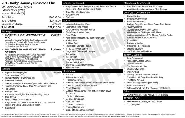 White 2016 Dodge Journey Crossroad FWD 4-Speed Automatic VLP 2.4L I4 DOHC 16V Dual VVT 3rd row seats: bench, 4-Wheel Disc Brakes, 4.28 Axle Ratio, 5-Year SiriusXM Traffic Service, 5-Year SiriusXM Travel Link Service, 6 Speakers, 8.4 Touchscreen Display, ABS brakes, Air Conditioning, Alloy wheels, AM/FM radio: SiriusXM, Anti-whiplash front head restraints, ATC w/3-Zone Temperature Control, Auto-dimming Rear-View mirror, Auto/StickTM, Brake assist, Bumpers: body-color, Cargo Net, CD player, Compass, Crossroad Equipment Group, Delay-off headlights, Driver door bin, Driver vanity mirror, Dual front impact airbags, Dual front side impact airbags, Electronic Stability Control, Four wheel independent suspension, Front & Rear Aimable LED Lamps, Front anti-roll bar, Front Bucket Seats, Front Center Armrest, Front dual zone A/C, Front fog lights, Front Passenger Forward Fold Flat Seat, Front reading lights, Garmin Navigation System, Heated door mirrors, Illuminated entry, Interior Observation Mirror, Knee airbag, Leather Seats w/Sport Mesh Inserts, Leather Wrapped Shift Knob, Leather Wrapped Steering Wheel, Light Gray Accent Stitching, Low tire pressure warning, Manufacturer's Statement of Origin, Navigation & Back-Up Camera Group, Occupant sensing airbag, Outside temperature display, Overhead airbag, Overhead Console, Overhead console, Panic alarm, ParkSense Rear Park Assist System, ParkView Rear Back-Up Camera, Passenger Assist Handles, Passenger door bin, Passenger In Seat Cushion Storage, Passenger vanity mirror, Power 4-Way Driver Lumber Adjust, Power 6-Way Driver Seat, Power door mirrors, Power steering, Power windows, Premium Cloth Low-Back Bucket Seats, Premium Door Trim Panel w/Stitching, Quick Order Package 22V Crossroad Plus, Radio data system, Radio: 4.3, Radio: 8.4, Radio: 8.4 Navigation, Rear air conditioning, Rear anti-roll bar, Rear reading lights, Rear seat center armrest, Rear window defroster, Rear window wiper, Reclining 3rd row seat, Remote keyless entry, Roof rack: rails only, SiriusXM Traffic, SiriusXM Travel Link, Speed control, Speed-sensing steering, Speed-Sensitive Wipers, Split folding rear seat, Steering wheel mounted audio controls, Sun Visors w/Illuminated Vanity Mirrors, Tachometer, Telescoping steering wheel, Tilt steering wheel, Tip Start, Touring Suspension, Traction control, Trip computer, Universal Garage Door Opener, Variably intermittent wipers, Wheels: 19 x 7 Hyper Black Aluminum.