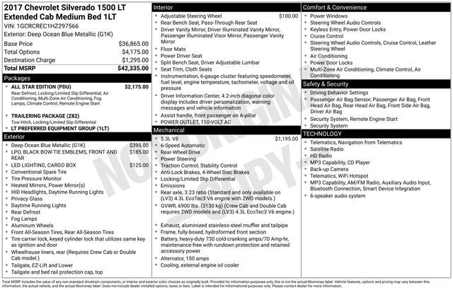 Deep Ocean Blue Metallic 2017 Chevrolet Silverado 1500 LT LT1 RWD 6-Speed Automatic Electronic with Overdrive EcoTec3 5.3L V8 WE DELIVER ANYWHERE, 6-Speed Automatic Electronic with Overdrive, Black Cloth, 110-Volt AC Power Outlet, 150 Amp Alternator, 4.2 Diagonal Color Display Driver Info Center, 6 Speaker Audio System, All Star Edition, Bluetooth® For Phone, Body Color Bodyside Moldings, Body-Color Door Handles, Body-Color Mirror Caps, Body-Color Power Adjustable Heated Outside Mirrors, Chrome Grille Surround, Color-Keyed Carpeting w/Rubberized Vinyl Floor Mats, Deep-Tinted Glass, Driver & Front Passenger Illuminated Vanity Mirrors, Dual-Zone Automatic Climate Control, Electric Rear-Window Defogger, EZ Lift & Lower Tailgate, Front Chrome Bumper, HD Radio, Leather Wrapped Steering Wheel w/Cruise Controls, Manual Tilt Wheel Steering Column, OnStar 3 Months Guidance Plan, OnStar w/4G LTE, Power Windows w/Driver Express Up, Preferred Equipment Group 1LT, Rear 60/40 Folding Bench Seat (Folds Up), Rear Chrome Bumper, Rear Vision Camera, Rear Wheelhouse Liners, Remote Keyless Entry, Remote Locking Tailgate, Remote Vehicle Starter System, Single Slot CD/MP3 Player, Steering Wheel Audio Controls, Thin Profile LED Fog Lamps, Trailering Package, 10-Way Power Driver's Seat Adjuster, 3.23 Rear Axle Ratio, 3.42 Rear Axle Ratio, 4-Wheel Disc Brakes, 40/20/40 Front Split Bench Seat, 6 Speakers, ABS brakes, Air Conditioning, Alloy wheels, AM/FM radio: SiriusXM, Auxiliary External Transmission Oil Cooler, Bodyside moldings, Brake assist, Bumpers: chrome, CD player, Cloth Seat Trim, Compass, Delay-off headlights, Driver door bin, Driver vanity mirror, Dual front impact airbags, Dual front side impact airbags, Electronic Stability Control, Emergency communication system: OnStar Guidance, Exterior Parking Camera Rear, Front & Rear Black Bowtie Emblems (LPO), Front anti-roll bar, Front Center Armrest w/Storage, Front reading lights, Front wheel independent suspension, Fully automatic headlights, Heated door mirrors, Heavy Duty Suspension, Heavy-Duty Rear Locking Differential, High-Intensity Discharge Headlights, Illuminated entry, LED Cargo Box Lighting, Low tire pressure warning, Manual Tilt/Telescoping Steering Column, Occupant sensing airbag, Outside temperature display, Overhead airbag, Overhead console, Panic alarm, Passenger door bin, Passenger vanity mirror, Power door mirrors, Power steering, Power windows, Premium audio system: Chevrolet MyLink, Radio data system, Radio: AM/FM 8 Diagonal Color Touch Screen, Rear reading lights, Rear step bumper, Remote keyless entry, SiriusXM Satellite Radio, Speed control, Speed-sensing steering, Split folding rear seat, Steering wheel mounted audio controls, Tachometer, Theft Deterrent System (Unauthorized Entry), Tilt steering wheel, Traction control, Trip computer, Variably intermittent wipers, Voltmeter, Wheels: 17 x 8 Bright Machined Aluminum, 6-Speed Automatic Electronic with Overdrive, Black Cloth, 110-Volt AC Power Outlet, 150 Amp Alternator, 4.2 Diagonal Color Display Driver Info Center, 6 Speaker Audio System, All Star Edition, Bluetooth® For Phone, Body Color Bodyside Moldings, Body-Color Door Handles, Body-Color Mirror Caps, Body-Color Power Adjustable Heated Outside Mirrors, Chrome Grille Surround, Color-Keyed Carpeting w/Rubberized Vinyl Floor Mats, Deep-Tinted Glass, Driver & Front Passenger Illuminated Vanity Mirrors, Dual-Zone Automatic Climate Control, Electric Rear-Window Defogger, EZ Lift & Lower Tailgate, Front Chrome Bumper, HD Radio, Leather Wrapped Steering Wheel w/Cruise Controls, Manual Tilt Wheel Steering Column, OnStar 3 Months Guidance Plan, OnStar w/4G LTE, Power Windows w/Driver Express Up, Preferred Equipment Group 1LT, Rear 60/40 Folding Bench Seat (Folds Up), Rear Chrome Bumper, Rear Vision Camera, Rear Wheelhouse Liners, Remote Keyless Entry, Remote Locking Tailgate, Remote Vehicle Starter System, Single Slot CD/MP3 Player, Steering Whe