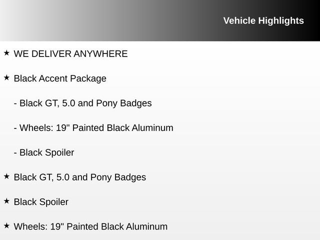 Shadow Black 2017 Ford Mustang GT Premium RWD 6-Speed Automatic with Select-Shift 5.0L V8 Ti-VCT WE DELIVER ANYWHERE, Black Accent Package, Black GT, 5.0 and Pony Badges, Black Spoiler, Wheels: 19 Painted Black Aluminum, 3.55 Limited Slip Rear Axle, 4-Wheel Disc Brakes, ABS brakes, Air Conditioning, Alloy wheels, AM/FM Stereo w/Single CD Player, Auto-dimming Rear-View mirror, Block heater, Brake assist, Bumpers: body-color, CD player, Compass, Delay-off headlights, Driver door bin, Driver vanity mirror, Dual front impact airbags, Dual front side impact airbags, Electronic Stability Control, Emergency communication system: 911 Assist, Exterior Parking Camera Rear, Four wheel independent suspension, Front anti-roll bar, Front Bucket Seats, Front Center Armrest, Front fog lights, Front reading lights, Fully automatic headlights, High-Intensity Discharge Headlights, Illuminated entry, Knee airbag, Low tire pressure warning, Occupant sensing airbag, Outside temperature display, Overhead airbag, Overhead console, Panic alarm, Passenger door bin, Passenger vanity mirror, Power door mirrors, Power driver seat, Power passenger seat, Power steering, Power windows, Radio data system, Rear anti-roll bar, Rear window defroster, Remote keyless entry, Reverse Sensing System, Security system, Speed control, Speed-sensing steering, Speed-Sensitive Wipers, Split folding rear seat, Steering wheel mounted audio controls, Tachometer, Telescoping steering wheel, Tilt steering wheel, Traction control, Trip computer, Variably intermittent wipers, Voltmeter, Wheels: 18 x 8 Magnetic Painted/Machined, Black Accent Package, Black GT, 5.0 and Pony Badges, Black Spoiler, Wheels: 19 Painted Black Aluminum.