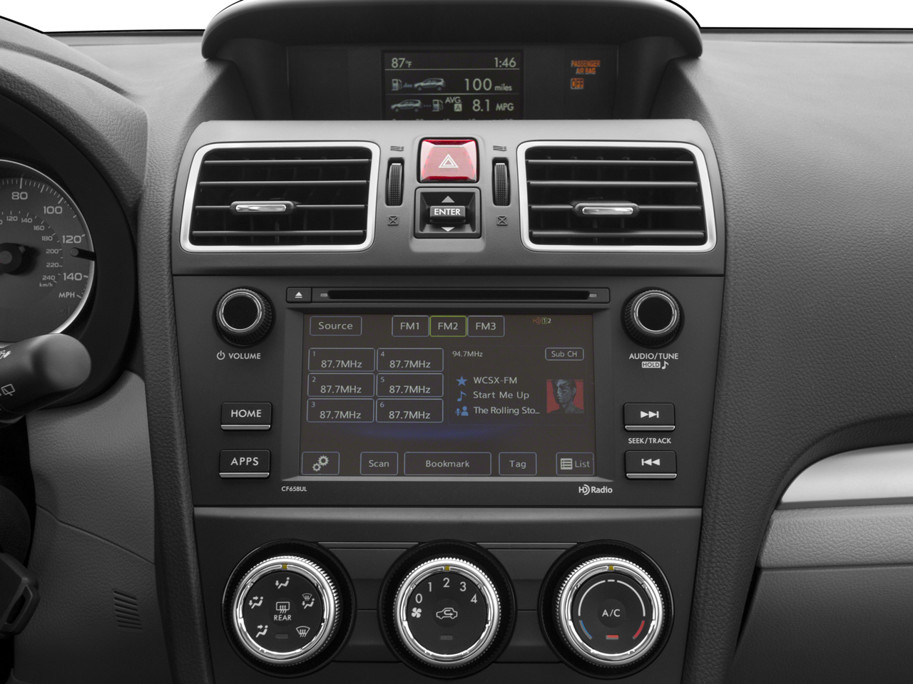 - Radio: Subaru Starlink 6.2" Multimedia System -inc: AM/FM stereo HD radio w/single-disc CD player w/MP3/WMA/CRR/RW file capability, simple touch gesture high resolution display, 6.2" LCD screen, Bluetooth® audio streaming connectivity, Bluetooth® hands-free phone connectivity, iPod control capability, rear-vision camera, smartphone integration: AHA and Pandora, Starlink cloud applications: calender, Glympse, iHeart Radio, music player, news, Stitcher and weather, USB port, 3.5mm auxiliary input jack, 4 speakers and body color roof mounted audio antenna StarLink enrollment cannot be applicable to Fleet Management Companies (FMCs) or to Commercial fleet accounts at this time.