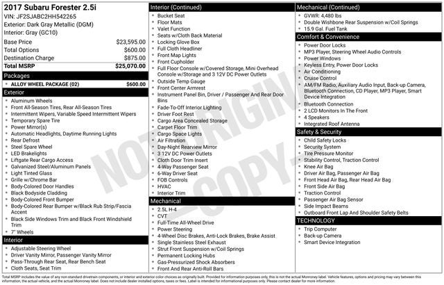 Dark Gray Metallic 2017 Subaru Forester 2.5i AWD Lineartronic CVT 2.5L 4-Cylinder DOHC 16V VVT 17 Machine-Finished Alloy Wheels, 3.70 Axle Ratio, 4 Speakers, 4-Wheel Disc Brakes, ABS brakes, Air Conditioning, Alloy Wheel Package, AM/FM radio, Black Finish Roof Rails, Brake assist, Bumpers: body-color, CD player, Cloth Upholstery, Driver door bin, Driver vanity mirror, Dual front impact airbags, Dual front side impact airbags, Electronic Stability Control, Emergency communication system: STARLINK, Exterior Parking Camera Rear, Four wheel independent suspension, Front anti-roll bar, Front Bucket Seats, Front Center Armrest, Front reading lights, Illuminated entry, Knee airbag, Low tire pressure warning, Occupant sensing airbag, Outside temperature display, Overhead airbag, Overhead console, Panic alarm, Passenger door bin, Passenger vanity mirror, Power door mirrors, Power steering, Power windows, Radio data system, Radio: Subaru Starlink 6.2 Multimedia System, Rear anti-roll bar, Rear window defroster, Rear window wiper, Remote keyless entry, Security system, Speed control, Split folding rear seat, Steering wheel mounted audio controls, Tachometer, Telescoping steering wheel, Tilt steering wheel, Traction control, Trip computer, Variably intermittent wipers, Wheels: 17 Steel w/Center Cap.