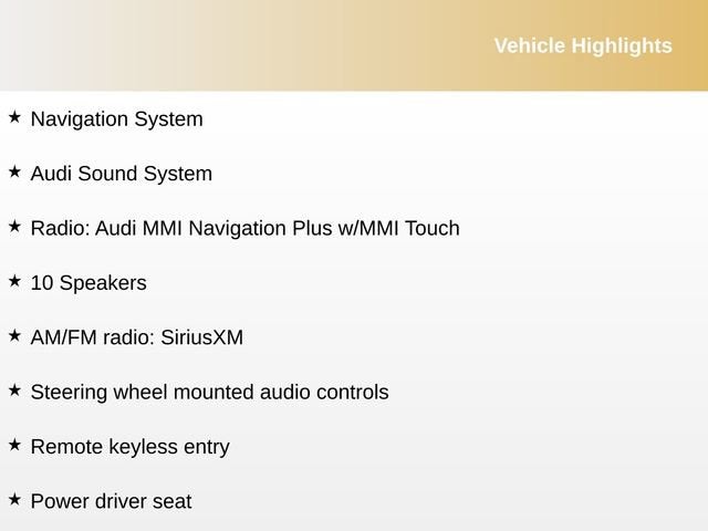 - Radio: Audi MMI Navigation Plus w/MMI Touch -inc: 8" central display screen, control knob and buttons in center console that operates climate control, central locking, instrument cluster, vehicle diagnostics, cellular phone, navigation, CD and radio functions, Audi concert radio (1CD) w/SiriusXM All Access service (w/3 month trial subscription), Audi smartphone interface (Apple CarPlay/Google Android Auto), Bluetooth® streaming audio and wireless technology preparation for mobile phone, HD Radio technology, SD card slot w/64GB capacity (dual slots) and SiriusXM satellite radio w/90-day subscription