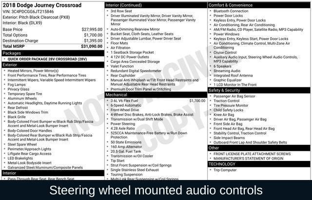 The 2018 Dodge Journey Crossroad offers impressive versatility, with a split-folding rear seat and available 3rd-row seating, making it easy to accommodate your passengers and cargo with ease. Safety is also a top priority, with features like advanced airbag systems, anti-lock brakes, and electronic stability control to provide you with added peace of mind on the road.