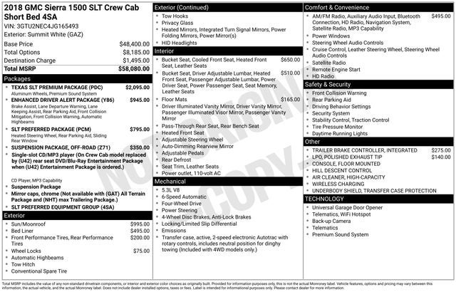 Clean CARFAX. Summit White 2018 GMC Sierra 1500 SLT EcoTec3 5.3L V8 6-Speed Automatic Electronic with Overdrive 4WD