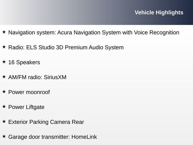 - Radio: ELS Studio 3D Premium Audio System -inc: 16 speakers, 7" color Multi-Information Display (MID) w/turn-by-turn guidance, Acura navigation system w/3D view, AcuraLink Real-Time Traffic w/street and freeway conditions, Traffic Rerouting, AcuraLink, Song By Voice, HD Radio, 2 USB charge ports (2.5A charge rear seat), true touchpad interface, 10.2" HD dual-content center display, mobile hotspot capability, natural language voice recognition, Apple Carplay, Siri Eyes Free, SMS, MMS text message and email capability, Bluetooth® HandsFreeLink wireless telephone interface, SiriusXM satellite radio, USB audio interface, Bluetooth® streaming audio, MP3/auxiliary input jack, Speed-Sensitive Volume Compensation (SVC), 2 USB charge ports (2.5A charge front seat) and Maintenance Minder system