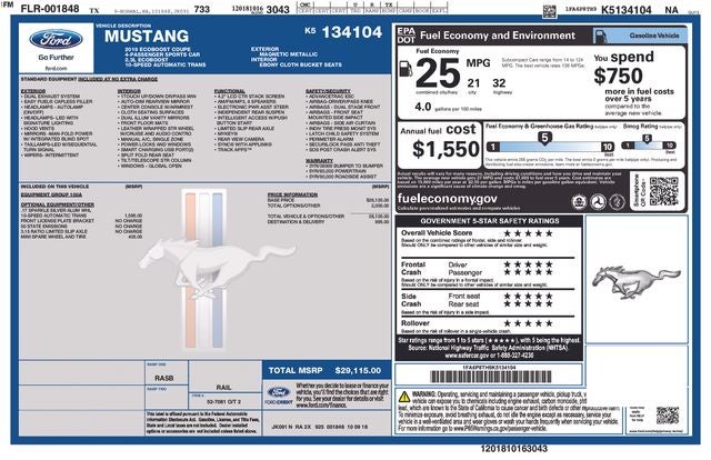 Magnetic Metallic 2019 Ford Mustang EcoBoost RWD 10-Speed Automatic EcoBoost 2.3L I4 GTDi DOHC Turbocharged VCT WE DELIVER ANYWHERE, Equipment Group 100A, 4-Wheel Disc Brakes, 6 Speakers, ABS brakes, Air Conditioning, Alloy wheels, AM/FM radio, AM/FM Stereo, Auto-dimming Rear-View mirror, Brake assist, Bumpers: body-color, Compass, Delay-off headlights, Driver door bin, Driver vanity mirror, Dual front impact airbags, Dual front side impact airbags, Electronic Stability Control, Emergency communication system: 911 Assist, Exterior Parking Camera Rear, Four wheel independent suspension, Front anti-roll bar, Front Bucket Seats, Front Center Armrest, Front reading lights, Fully automatic headlights, Illuminated entry, Knee airbag, Leather Shift Knob, Low tire pressure warning, Occupant sensing airbag, Outside temperature display, Overhead airbag, Overhead console, Panic alarm, Passenger door bin, Passenger vanity mirror, Power door mirrors, Power steering, Power windows, Radio data system, Rear anti-roll bar, Rear window defroster, Remote keyless entry, Security system, Speed control, Speed-sensing steering, Speed-Sensitive Wipers, Split folding rear seat, Steering wheel mounted audio controls, SYNC Communications & Entertainment System, Tachometer, Telescoping steering wheel, Tilt steering wheel, Traction control, Trip computer, Variably intermittent wipers, Voltmeter, Wheels: 17 Sparkle Silver-Painted Aluminum, Equipment Group 100A.