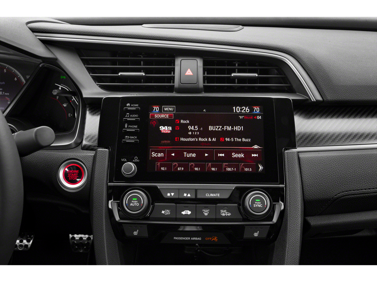 - Radio: 450-Watt AM/FM/HD/SiriusXM Audio System -inc: 10 premium speakers including subwoofer, 7-inch display audio w/high-resolution electrostatic touch-screen, knob and hard keys for primary controls and customizable feature settings, HondaLink, Apple CarPlay integration, Android Auto integration, Bluetooth® HandsFreeLink, Bluetooth® streaming audio, SMS text message function, radio data system (RDS), speed-sensitive volume compensation (SVC), 1.0-amp USB audio interface port in center console, 1.5-amp USB smartphone/audio interface port in front console, illuminated steering wheel-mounted audio controls and fin-type roof-mounted antenna