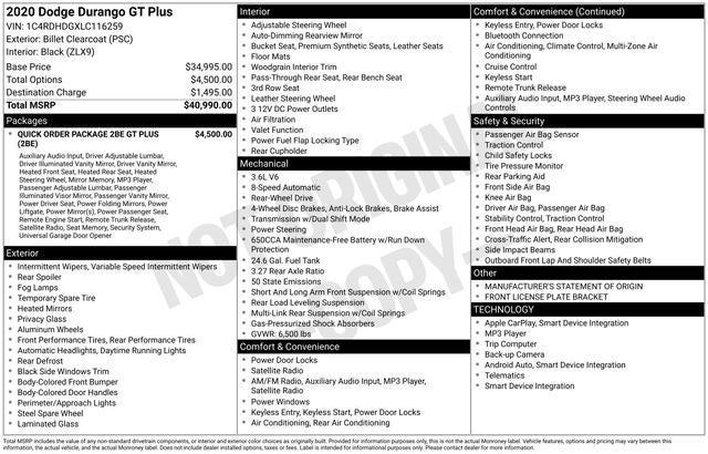 115V Auxiliary Power Outlet, 180 Amp Alternator, 3.27 Rear Axle Ratio, 3rd row seats: split-bench, 4-Wheel Disc Brakes, 6 Speakers, ABS brakes, Air Conditioning, Alloy wheels, AM/FM radio: SiriusXM, Anti-whiplash front head restraints, Apple CarPlay, Apple CarPlay/Android Auto, Auto-Dimming Exterior Driver Mirror, Auto-dimming Rear-View mirror, Auto-leveling suspension, Automatic temperature control, Brake assist, Bright Cargo Area Scuff Pads, Bright Front Door Sill Scuff Pads, Bumpers: body-color, Cloth Low-Back Bucket Seats, Compass, Delay-off headlights, Driver door bin, Driver vanity mirror, Dual front impact airbags, Dual front side impact airbags, Dual Remote USB Port - Charge Only, Electronic Stability Control, Emergency communication system: Roadside Assistance/9-1-1 Call, Exterior Mirrors w/Memory, Four wheel independent suspension, Front anti-roll bar, Front Bucket Seats, Front Center Armrest w/Storage, Front dual zone A/C, Front fog lights, Front License Plate Bracket, Front reading lights, Fully automatic headlights, Google Android Auto, GPS Antenna Input, Heated door mirrors, Heated Front Seats, Heated Second Row Seats, Heated Steering Wheel, Illuminated entry, Integrated Center Stack Radio, Integrated Voice Command w/Bluetooth®, Knee airbag, Leather steering wheel, Leather Suede Bucket Seats, Low tire pressure warning, Manufacturer's Statement of Origin, Occupant sensing airbag, Outside temperature display, Overhead airbag, Overhead console, Panic alarm, ParkView Rear Back-Up Camera, Passenger door bin, Passenger vanity mirror, Power 6x9 Multi-Function Foldaway Mirrors, Power 8-Way Driver Memory 6-Way Passenger Seats, Power door mirrors, Power driver seat, Power Driver/Passenger 4-Way Lumbar Adjust, Power Liftgate, Power steering, Power windows, Quick Order Package 2BE GT Plus, Radio: Uconnect 4 w/7 Display, Radio/Driver Seat/Mirrors Memory, Rear air conditioning, Rear anti-roll bar, Rear Load Leveling Suspension, Rear reading lights, Rear seat center armrest, Rear window defroster, Rear window wiper, Remote keyless entry, Remote Start System, Security Alarm, SiriusXM Satellite Radio, Speed control, Speed-Sensitive Wipers, Split folding rear seat, Spoiler, Steering wheel mounted audio controls, Sun Visors w/Illuminated Vanity Mirrors, Tachometer, Telescoping steering wheel, Tilt steering wheel, Traction control, Trip computer, Universal Garage Door Opener, USB Host Flip, Variably intermittent wipers, Wheels: 20 x 8.0 Satin Carbon - Design 1.