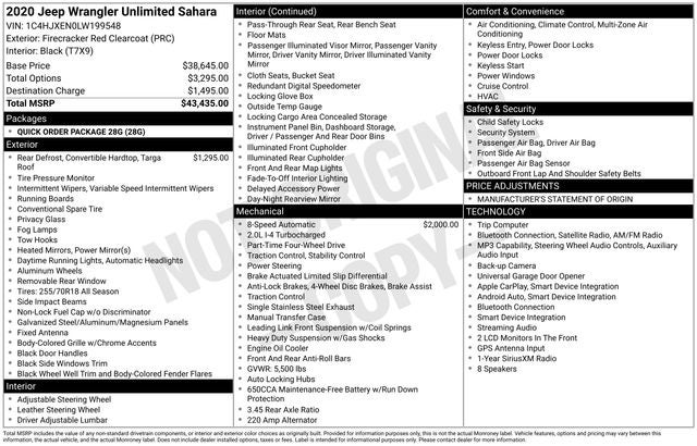 Firecracker Red Clearcoat 2020 Jeep Wrangler Unlimited Sahara 4WD 8-Speed Automatic 2.0L I4 DOHC WE DELIVER ANYWHERE, 1-Year SiriusXM Radio Service, 3.45 Rear Axle Ratio, 4-Wheel Disc Brakes, 8 Speakers, ABS brakes, Air Conditioning, Alloy wheels, AM/FM radio: SiriusXM, Apple CarPlay, Apple CarPlay/Android Auto, Automatic temperature control, Aux Battery, Black 3-Piece Hard Top, Brake assist, Cloth Low-Back Bucket Seats, Compass, Delay-off headlights, Driver door bin, Driver vanity mirror, Dual front impact airbags, Dual front side impact airbags, Electronic Stability Control, Freedom Panel Storage Bag, Front anti-roll bar, Front Bucket Seats, Front Center Armrest w/Storage, Front dual zone A/C, Front fog lights, Front License Plate Bracket, Front reading lights, Fully automatic headlights, Garage door transmitter, Google Android Auto, GPS Antenna Input, Heated door mirrors, Heavy Duty Suspension w/Gas Shocks, Illuminated entry, Integrated roll-over protection, Integrated Voice Command w/Bluetooth®, Leather steering wheel, Low tire pressure warning, Manufacturer's Statement of Origin, No Soft Top, Non-Lock Fuel Cap w/o Discriminator, Occupant sensing airbag, Outside temperature display, Panic alarm, ParkView Rear Back-Up Camera, Passenger door bin, Passenger vanity mirror, Power door mirrors, Power steering, Power windows, Quick Order Package 28G, Radio data system, Radio: Uconnect 4 w/7 Display, Rear anti-roll bar, Rear reading lights, Rear Window Defroster, Rear Window Wiper/Washer, Remote keyless entry, Security system, Speed control, Split folding rear seat, Steering wheel mounted audio controls, Stop-Start Dual Battery System, Tachometer, Telescoping steering wheel, Tilt steering wheel, Traction control, Trip computer, Variably intermittent wipers, Voltmeter, Wheels: 18 x 7.5 Polished w/Gray Spokes.