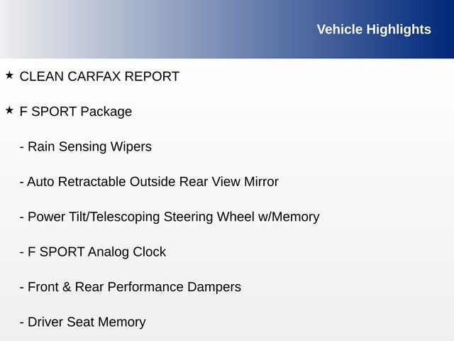CLEAN CARFAX REPORT, Black w/Hadori Aluminum w/F SPORT NuLuxe Seat Trim, 10.2 Head-Up Display (HUD), 8 TFT LCD Instrument Panel Display, Active Noise Control, Auto Retractable Outside Rear View Mirror, Driver Seat Memory, Electrochromic Rear-View Mirror, F SPORT Analog Clock, F SPORT Gauges w/Movable Display Ring, F SPORT Grille w/Dark Surround, F SPORT Package, F SPORT Pedals, F SPORT Shift Lever & Knob, Front & Rear Performance Dampers, Hadori Aluminum Interior Trim, Heated & Ventilated Seats, Power Tilt/Telescoping Steering Wheel w/Memory, Radio: Navigation w/Mark Levinson Audio, Rain Sensing Wipers, Rear Spoiler.
