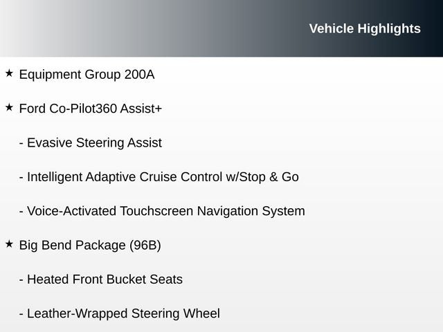 Big Bend Package (96B), Equipment Group 200A, Evasive Steering Assist, Exterior Parking Camera Rear, Ford Co-Pilot360 Assist+, Fully automatic headlights, Heated Front Bucket Seats, Intelligent Adaptive Cruise Control w/Stop & Go, Leather-Wrapped Steering Wheel, Reverse Sensing System, Voice-Activated Touchscreen Navigation System, Wireless Charging Pad.