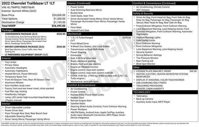 Step inside the 2022 Chevrolet TrailBlazer LT and discover a cabin that seamlessly blends style and functionality. The spacious and well-appointed interior features premium cloth seating, a 6-speaker audio system, and an 8-inch touchscreen display with the latest Chevrolet Infotainment 3 technology. Stay connected and entertained with wireless Apple CarPlay and Android Auto integration, while the available Driver Confidence Package provides added peace of mind with features like Lane Change Alert with Side Blind Zone Alert and Rear Cross Traffic Alert.