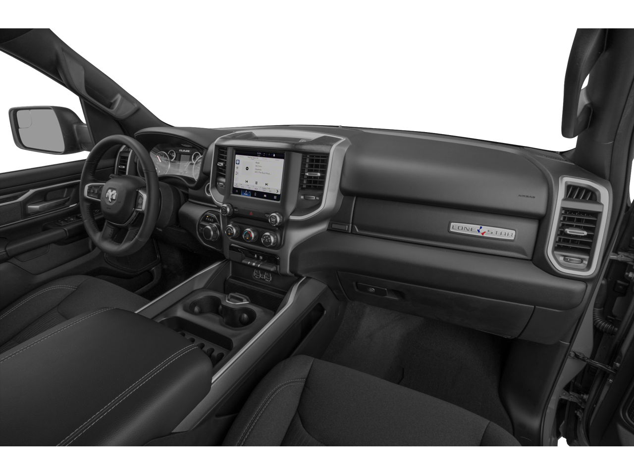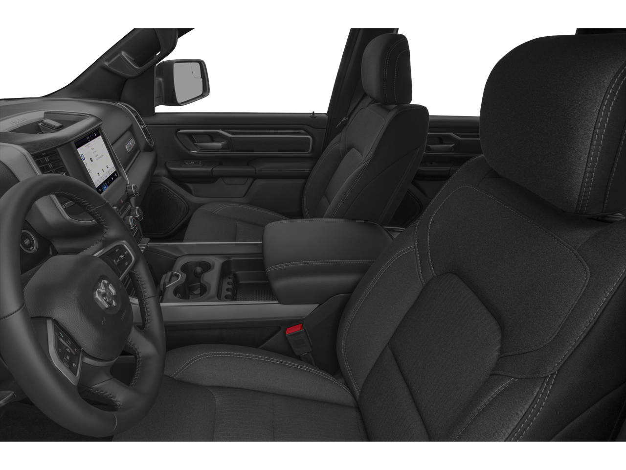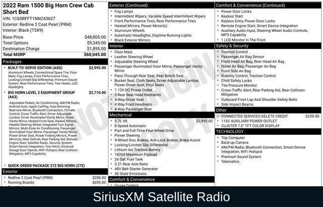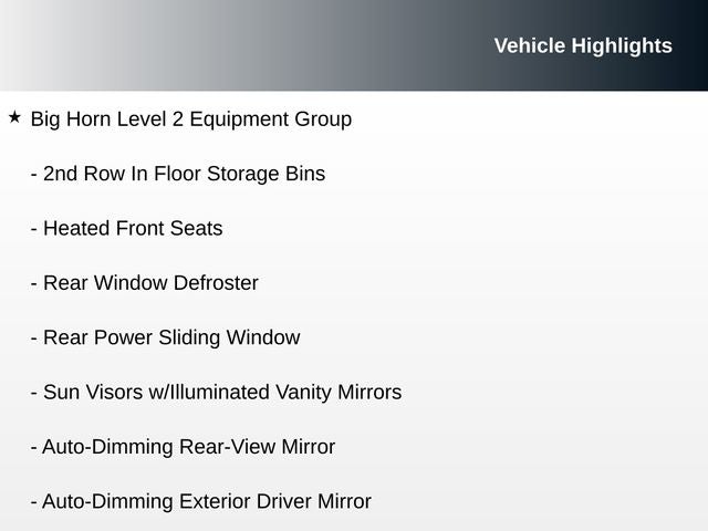 115V Auxiliary Power Outlet, 115V Auxiliary Rear Power Outlet, 20 x 9 Aluminum Wheels, 2nd Row In Floor Storage Bins, 4G LTE Wi-Fi Hot Spot, 8.4 Touchscreen Display, 9 Amplified Speakers w/Subwoofer, Air Conditioning ATC w/Dual Zone Control, Apple CarPlay, Auto-Dimming Exterior Driver Mirror, Auto-Dimming Rear-View Mirror, Big Horn Level 2 Equipment Group, Black Door Handles, Black Exterior Mirrors, Black Exterior Truck Badging, Black Front Bumper, Black Headlamp Bezels, Black Onyx Interior Accent, Black Premium Power Mirrors, Black Rear Bumper, Bluetooth® Handsfree Phone & Audio, Body Color Fender Flares, Built-To-Serve Edition, Built-To-Serve Edition I/P Badge, Class IV Receiver Hitch, Cluster 7.0 TFT Color Display, Connectivity - US/Canada, Convex Wide-Angle Mirror Insert, Dual Exhaust w/Black Tips, E-Locker Rear Axle, Exterior Mirrors Courtesy Lamps, Exterior Mirrors w/Heating Element, Exterior Mirrors w/Supplemental Signals, Falken Brand Tires, For Details, Visit DriveUconnect.com, Front Extra HD Shock Absorbers, Front LED Fog Lamps, Global Telematics Box Module (TBM), Glove Box Lamp, Google Android Auto, GPS Antenna Input, Grille Surround 1 Black Texture 1 Black, Heated Front Seats, Heated Steering Wheel, Hill Descent Control, Integrated Center Stack Radio, LED Reflector Headlamps, LED Taillamps, Media Hub w/2 Charge Only USBs, MOPAR Front & Rear Rubber Floor Mats, MOPAR Lockable Console Storage, ParkSense Front/Rear Park Assist w/Stop, Power 2-Way Driver Lumbar Adjust, Power 8-Way Driver Seat, Power Adjustable Pedals, Power-Folding Mirrors, Premium Cloth/Vinyl Bucket Seats, Radio: Uconnect 5 W w/8.4 Display, Raised Ride Height, RAM Grille Badge - Black, Rear Dome w/On/Off Switch Lamp, Rear Extra HD Shock Absorbers, Rear Power Sliding Window, Rear Window Defroster, Remote Start System, Security Alarm, SiriusXM Radio Service, SiriusXM Satellite Radio, Sun Visors w/Illuminated Vanity Mirrors, Tow Hooks, Universal Garage Door Opener, US Flag Decal, USB Host Flip.