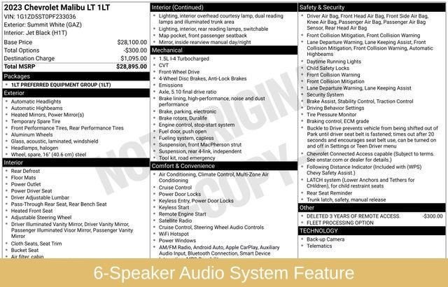 Elevate your driving experience with the advanced technology features of the 2023 Chevrolet Malibu LT 1LT. The Infotainment 3 Plus system with a 8-inch touchscreen seamlessly integrates your smartphone, allowing you to access your favorite apps, stream music, and stay connected on the go. The Bose premium audio system and SiriusXM satellite radio provide exceptional sound quality, while the OnStar and Chevrolet connected services keep you safe and secure.
