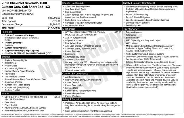 - Custom Convenience Package includes (BTV) Remote Start with (UTJ) content theft alarm, (C49) rear-window defogger, (UF2) bed LED cargo area lighting and (QT5) EZ Lift power lock and release tailgate (Included and only available with (PDX) Custom Value Package.)