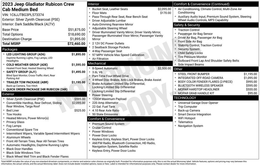 Additionally, this Gladiator Rubicon is equipped with the Trailer Tow Package, LED Lighting Group, Cold Weather Group, Safety Group, and more. Indulge in the luxurious Dark Saddle/Black leather-trimmed bucket seats, the Mopar Hardtop Headliner, and the Mopar Grab Handle Kit for an unparalleled driving experience.