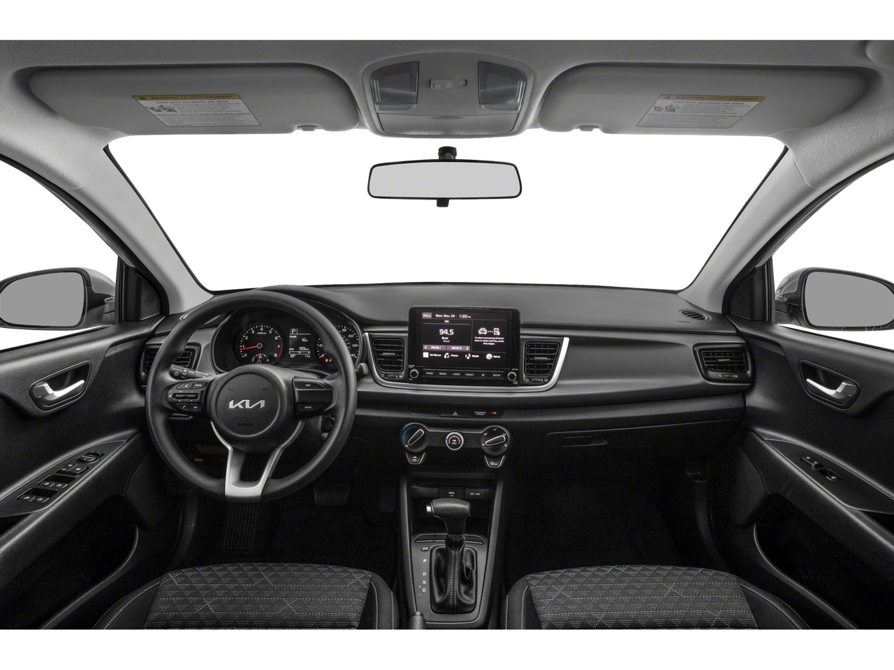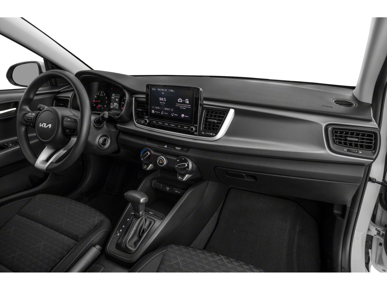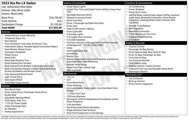 Clean CARFAX. Silky Silver 2023 Kia Rio LX FWD CVT 1.6L 4-Cylinder 6 Speakers, ABS brakes, Air Conditioning, AM/FM radio, Brake assist, Bumpers: body-color, Driver door bin, Driver vanity mirror, Dual front impact airbags, Dual front side impact airbags, Electronic Stability Control, Front anti-roll bar, Front Bucket Seats, Front reading lights, Front wheel independent suspension, Fully automatic headlights, Heated door mirrors, Illuminated entry, Low tire pressure warning, Occupant sensing airbag, Outside temperature display, Overhead airbag, Overhead console, Panic alarm, Passenger door bin, Passenger vanity mirror, Power door mirrors, Power steering, Power windows, Radio: AM/FM/MP3 Audio System, Rear window defroster, Speed-sensing steering, Steering wheel mounted audio controls, Tachometer, Tilt steering wheel, Traction control, Trip computer, Variably intermittent wipers, Wheels: 15 x 5.5J Steel w/Full Covers, Woven & Tricot Cloth Seat Trim.