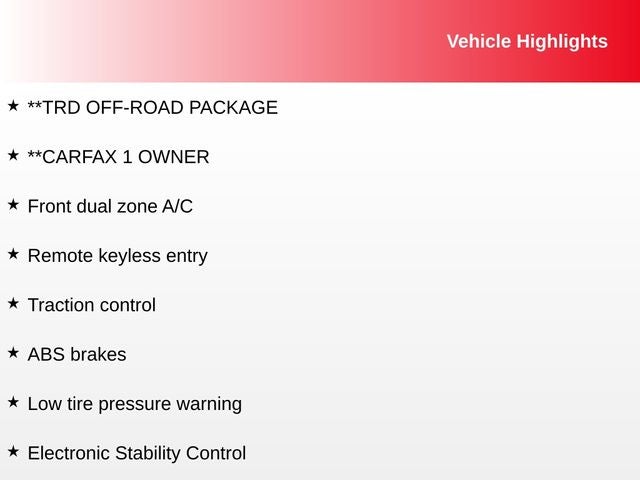 Powered by a robust 3.5L V6 engine and equipped with 4WD, this Tacoma is ready to take you anywhere you need to go. The TRD Off-Road package adds a host of off-road-focused features, including an electronically locking rear differential, Bilstein shocks, and an off-road-tuned suspension, ensuring you have the confidence and capability to tackle even the toughest terrain.