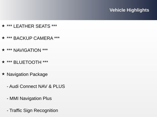 - Navigation Package -inc: MMI Navigation Plus, Traffic Sign Recognition, Audi Connect NAV & PLUS, Audi app store and 6-month trial subscription