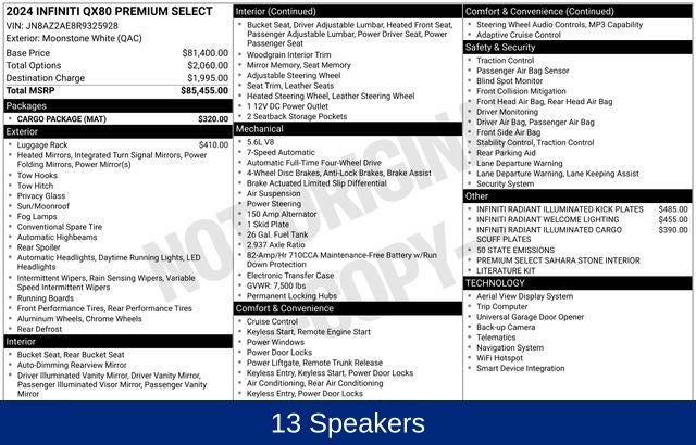 - Radio: Bose Premium Audio System w/13 Speakers -inc: driver's audio stage, speed-sensitive volume control, INFINITI InTouch 12.3" interactive display, INFINITI InTouch services (1-year premium trial and 5-year select trial), INFINITI navigation w/lane guidance and 3D building graphics, MapCare w/over-the-air update compatibility (5-year trial period), premium traffic w/live traffic information (5-year trial period), TomTom weather (5-year trial period), HD radio technology, Apple CarPlay w/wireless Apple CarPlay integration, Android Auto, Siri Eyes Free, Wi-Fi hotspot (30-day or 1GB trial, whichever comes first), Alexa built-in, SiriusXM radio (3-month trial period), SiriusXM Traffic (3-month trial period), SiriusXM Travel Link (3-month trial period): weather, fuel prices, stock prices, sports scores, movie listings and parking, over-the-air head unit update capability (5-year trial period), INFINITI Voice recognition for audio, navigation, Bluetooth® and vehicle information, Bluetooth® hands-free phone system and streaming audio, hands-free text messaging assistant, 2x USB ports for compatible devices for audio streaming and wireless phone charger