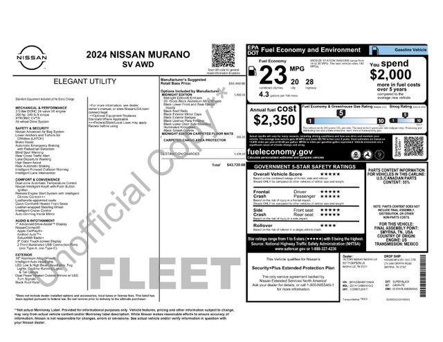 Black Splash Guards, Illuminated Kickplates, Midnight Edition Badge, SV Midnight Edition Package, Wheels: 20 Gloss Black Aluminum Alloy, 4-Wheel Disc Brakes, 4.667 Axle Ratio, 6 Speakers, ABS brakes, Air Conditioning, Alloy wheels, AM/FM radio: SiriusXM, AM/FM/CD/MP3/WMA Audio System, Auto High-beam Headlights, Auto-dimming Rear-View mirror, Automatic temperature control, Blind Spot Warning, Brake assist, Bumpers: body-color, CD player, Child-Seat-Sensing Airbag, Compass, Delay-off headlights, Driver door bin, Driver vanity mirror, Dual front impact airbags, Dual front side impact airbags, Electronic Stability Control, Four wheel independent suspension, Front anti-roll bar, Front Bucket Seats, Front Center Armrest, Front dual zone A/C, Front fog lights, Front reading lights, Fully automatic headlights, Heated door mirrors, Heated Front Bucket Seats, HEATED FRONT SEATS, Illuminated entry, Knee airbag, Leather steering wheel, Leatherette-Appointed Seat Trim, Low tire pressure warning, Midnight Edition Carpeted Floor Mats, NissanConnect featuring Apple CarPlay and Android Auto, Occupant sensing airbag, Outside temperature display, Overhead airbag, Overhead console, Panic alarm, Passenger door bin, Passenger vanity mirror, Power door mirrors, Power driver seat, Power passenger seat, Power steering, Power windows, Radio data system, Rear anti-roll bar, Rear reading lights, Rear seat center armrest, Rear side impact airbag, Rear window defroster, Rear window wiper, Remote keyless entry, Security system, Speed control, Speed-sensing steering, Speed-Sensitive Wipers, Splash Guards & Illuminated Kick Plates, Split folding rear seat, Spoiler, Steering wheel mounted audio controls, Tachometer, Telescoping steering wheel, Tilt steering wheel, Traction control, Trip computer, Turn signal indicator mirrors, Variably intermittent wipers, Wheels: 18 Machined Aluminum-Alloy, Black Splash Guards, Illuminated Kickplates, Midnight Edition Badge, SV Midnight Edition Package, Wheels: 20 Gloss Black Aluminum Alloy.