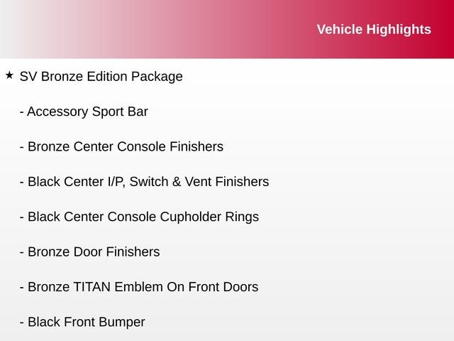 120V/12V Outlets In Back Of Center Console, 2 Illuminated USB-A Ports In Back Of Center Console, Accessory Bronze Edition Floor Mats, Accessory Sport Bar, Auto-Dimming Rear-View Mirror, Black Center Console Cupholder Rings, Black Center I/P, Switch & Vent Finishers, Black Driver & Front Passenger I/P Finishers, Black Front Bumper, Black Headliner & A-Pillar, Black Utility Mirror, Bronze Center Console Finishers, Bronze Door Finishers, Bronze Steering Wheel Finishers, Bronze TITAN Emblem On Front Doors, Dedicated Cell Phone Holder, Dual Illuminated Vanity Mirror Front Sun Visors, Dual Zone Automatic HVAC, Front & Rear Parking Sensors, Front Door TITAN Emblem Delete, Full LED Headlamp, Gloss Black Front Grille Surround, Heated Front Captain's Chairs, Intelligent Key System, Leather-Wrapped Steering Wheel, Mood Light, NissanConnect Services, Overhead Console w/Sunglass Holder, Power Sliding Rear Window w/Defogger, Rear HVAC Vents, Remote Engine Start System, Special Liftgate Emblem Treatments, SV Bronze Edition Package, SV Convenience Package, Wheels: 20 x 8.0JJ Bronze, Wi-Fi Hotspot, 3.692 Axle Ratio, 4-Wheel Disc Brakes, 6 Speakers, ABS brakes, Accessory Utility Package, Air Conditioning, Alloy wheels, AM/FM radio: SiriusXM, Auto High-beam Headlights, Blind Spot Warning, Brake assist, Bumper Step, Bumpers: chrome, Cloth Seat Trim, Driver door bin, Drop In Bed Liner, Dual front impact airbags, Dual front side impact airbags, Electronic Stability Control, Front anti-roll bar, Front Center Armrest w/Storage, Front reading lights, Front Split Bench Seat (40/20/40), Front wheel independent suspension, Fully automatic headlights, Heated door mirrors, Illuminated entry, Knee airbag, Loop Side Steps, Low tire pressure warning, NissanConnect featuring Apple CarPlay and Android Auto, Occupant sensing airbag, Outside temperature display, Overhead airbag, Overhead console, Panic alarm, Passenger door bin, Passenger vanity mirror, Power door mirrors, Power steering, Power windows, Radio data system, Radio: AM/FM Audio System, Rear anti-roll bar, Rear Parking Sensors, Rear reading lights, Rear seat center armrest, Rear step bumper, Rear window defroster, Remote keyless entry, Security system, Speed control, Speed-sensing steering, Speed-Sensitive Wipers, Splash Guards, Split folding rear seat, Steering wheel mounted audio controls, Tachometer, Telescoping steering wheel, Tilt steering wheel, Traction control, Trailer Hitch, Trip computer, Variably intermittent wipers, Voltmeter, Wheels: 18 x 8 Painted & Machined Alloy, 120V/12V Outlets In Back Of Center Console, 2 Illuminated USB-A Ports In Back Of Center Console, Accessory Bronze Edition Floor Mats, Accessory Sport Bar, Auto-Dimming Rear-View Mirror, Black Center Console Cupholder Rings, Black Center I/P, Switch & Vent Finishers, Black Driver & Front Passenger I/P Finishers, Black Front Bumper, Black Headliner & A-Pillar, Black Utility Mirror, Bronze Center Console Finishers, Bronze Door Finishers, Bronze Steering Wheel Finishers, Bronze TITAN Emblem On Front Doors, Dedicated Cell Phone Holder, Dual Illuminated Vanity Mirror Front Sun Visors, Dual Zone Automatic HVAC, Front & Rear Parking Sensors, Front Door TITAN Emblem Delete, Full LED Headlamp, Gloss Black Front Grille Surround, Heated Front Captain's Chairs, Intelligent Key System, Leather-Wrapped Steering Wheel, Mood Light, NissanConnect Services, Overhead Console w/Sunglass Holder, Power Sliding Rear Window w/Defogger, Rear HVAC Vents, Remote Engine Start System, Special Liftgate Emblem Treatments, SV Bronze Edition Package, SV Convenience Package, Wheels: 20 x 8.0JJ Bronze, Wi-Fi Hotspot.