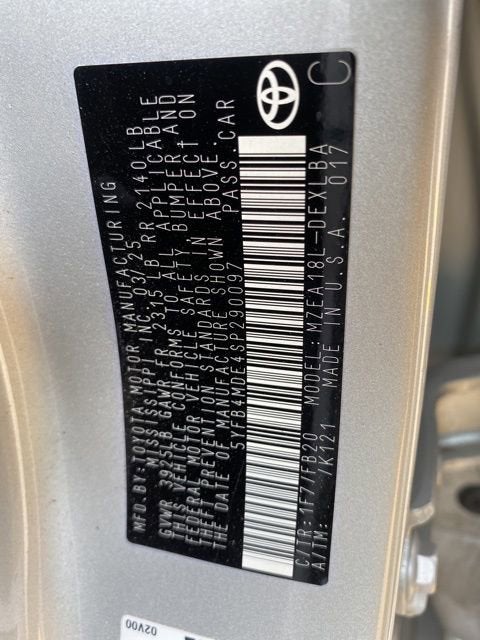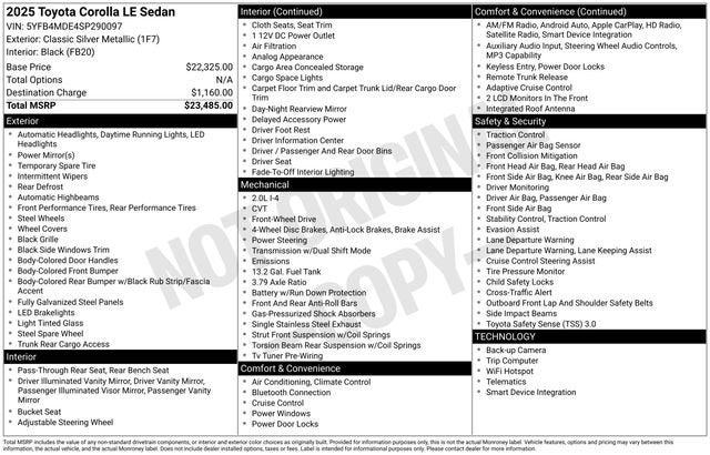 4-Wheel Disc Brakes, 6 Speakers, ABS brakes, Air Conditioning, AM/FM radio: SiriusXM, Apple CarPlay/Android Auto, Auto High-beam Headlights, Automatic temperature control, Brake assist, Bumpers: body-color, Delay-off headlights, Driver door bin, Driver vanity mirror, Dual front impact airbags, Dual front side impact airbags, Electronic Stability Control, Emergency communication system: Safety Connect (up to 10-year trial subscription), Exterior Parking Camera Rear, Fabric Seat Trim, Front anti-roll bar, Front Bucket Seats, Front Center Armrest, Front reading lights, Front wheel independent suspension, Fully automatic headlights, Illuminated entry, Knee airbag, Low tire pressure warning, Occupant sensing airbag, Outside temperature display, Overhead airbag, Panic alarm, Passenger door bin, Passenger vanity mirror, Power door mirrors, Power steering, Power windows, Radio data system, Radio: 8 Toyota Audio Multimedia, Rear anti-roll bar, Rear seat center armrest, Rear side impact airbag, Rear window defroster, Remote keyless entry, Speed control, Split folding rear seat, Steering wheel mounted audio controls, Tachometer, Telescoping steering wheel, Tilt steering wheel, Traction control, Trip computer, Wheels: 16 Steel with Covers.
